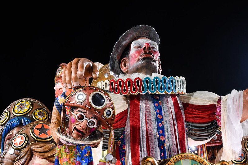 Voltando ao carro alegórico de Leandro, o carnavalesco não só se compromete com o visual, mas também com sua montagem e encenação enquanto discurso. Com isso, toca nos fundamentos da alegoria, entendida aqui como a combinação de elementos e motivos para gerar um novo sentido ou conceito.