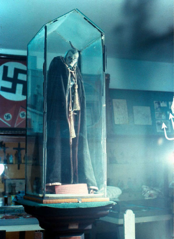 Ainda para ressaltar o uso perspicaz por Leandro da montagem na alegoria Dia 28: rebuliço no olhar do mamulengo, menciono a fotografia feita pelo artista Luiz Alphonsus, em 1979, de um Exu “mefistófeles” presente no acervo do Museu da Polícia Civil do Rio de Janeiro e analisada pelo pesquisador Arthur Valle. O acervo é constituído por objetos apreendidos em batidas policiais, muitos deles em terreiros de religiões de matriz africana. As apreensões foram realizadas até meados da década de 1940, quando ainda estava em vigor uma legislação penal que criminalizava oficialmente essas práticas em nosso país. Nesse caso, ao enquadrar e “montar” a imagem de Exu junto a uma flâmula nazista ao fundo, Alphonsus expõe a estratégia de estigmatização por meio da apreensão e reunião de determinados objetos considerados igualmente vestígios de práticas criminosas, com a polícia equiparando a um símbolo nazista um objeto de culto de matriz africana, prática resultante de uma legislação preconceituosa e racista.