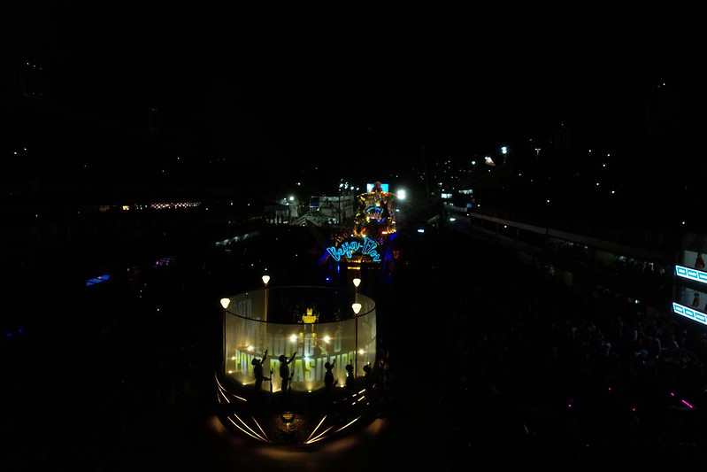 Tanto nas dependências do sambódromo como nas redes sociais houve fortes reações negativas à iluminação-espetáculo. Creio que talvez muitas dessas críticas se deram por conta da duração do expediente em algumas agremiações, mas o recurso em si não me parece negativo. Em um formato que se assumiu como algo para ser assistido pelo menos desde a década de 1960, e que apresenta assimilações do contexto cultural do espetáculo das classes médias – como a divisão da massa popular entre palco e plateia, além da entrada mediante pagamento de ingresso – a chegada a esse tipo de “aprimoramento” cênico parece um caminho natural.