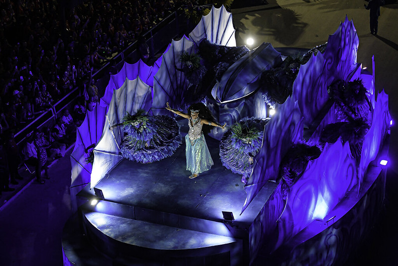 A Beija-Flor foi a que usou o recurso por mais vezes e mais tempo durante sua apresentação, tanto na comissão de frente quanto em alegorias e em alas. A escola tijucana, primeira a lançar mão da luz, concentrou o recurso na comissão de frente, escolhendo um tom de azul que se fundia à cor do elemento alegórico representando o mar, do qual emergia uma Iemanjá interpretada pela atriz Juliana Alves, sedutoramente poderosa e preta – como deveria ser e estar no imaginário coletivo, uma vez que o candomblé é religião de matriz africana, negra. (É, pois, sempre digno de nota o papel pedagógico do carnaval das Escolas, até quando ele vem para desconstruir mitos e nos dizer o óbvio através de sua máquina imagética).