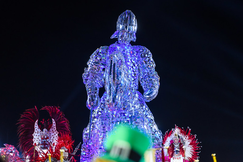 Tão ou mais importante que o tamanho das alegorias foi o desenho vazado das estruturas alegóricas trazidas pelo carnavalesco, o que possibilitou leitura e fruição mais plenas por parte da recepção, no interior de espaço cênico formado pela Sapucaí, uma passarela que tem a audiência lateralizada. Com a possibilidade de a visão (assim como a luz) atravessar a alegoria de um lado para o outro, a fruição do elemento escultórico ganha novas camadas perceptivas. O São Jorge sobre o dragão assinado por Barros e escultores da Vila simboliza com eloquência e beleza o que quero dizer. Barros também não saiu deste carnaval sem alguns de seus efeitos típicos; de seus momentos mais célebres. Um “clássico” de seu repertório foi a troca de roupa da porta-bandeira durante o desfile por seus guardiões. Antes disso, na comissão de frente, houve o ilusionismo do momento em que a mesa de Baco era repartida, e as ninfas, embriagadas pelo vinho, passavam a flutuar (talvez sem imperiosa necessidade ao enredo).
