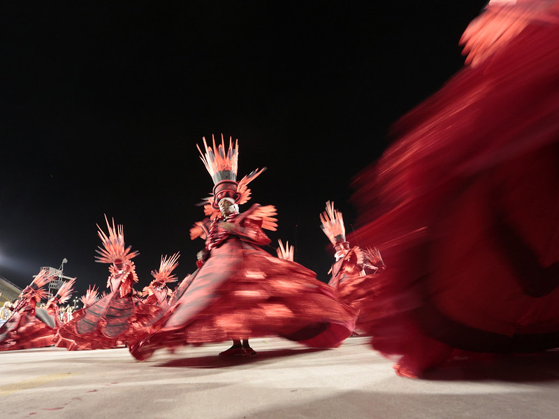 Dois grandes trunfos plásticos foram o uso de monocromia e de linhas pretas, vinhas do grafismo indígena, nas fantasias. O primeiro segmento da escola, com comissão de frente, a 1a ala (“Viajantes literários”, com tentáculos de polvo nas costas) e a ala das baianas tingidas em vermelho vivo. A marcação dessas fantasias de uma única cor com o grafismo em preto destacou a escrita ancestral dos povos originários da Amazônia, mas também fez com que os componentes da Porto da Pedra tivessem seus corpos marcados e destacados pelas linhas, como se eles também fossem um desenho.